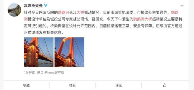 据武汉市城投集团公司通报称,26日14时许,鹦鹉洲长江大桥双向桥面出现可感知的上下波形晃动,武汉市城投集团公司立即通知桥梁设计单位和相关专家实地踏勘,分析异常震动产生的原因,目前专家研判认为,此次桥梁异常振动系特定风况引起,振幅在设计允许范围内;桥梁结构运行正常,安全有保障。