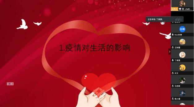 家住武汉的丁昊雯同学首先发言,她说,“疫情期间,武汉的基本生活有保障,物资还算充足,物价涨幅不是很大,作为普通市民,封城期间群众心理较为紧张,复工复产正在有序进行。” 姜修翔同学则叙述了自己从武汉返乡的经历,坦言在返乡后得到了很多关照,疫情过后,心理疏导很重要。其他同学也各自谈到自己家乡的情况,举出疫情防控的措施,指出南大与武大两所高校也在疫情期间,密切关注学生的健康情况。随后观看视频《武汉——我想你了》。
