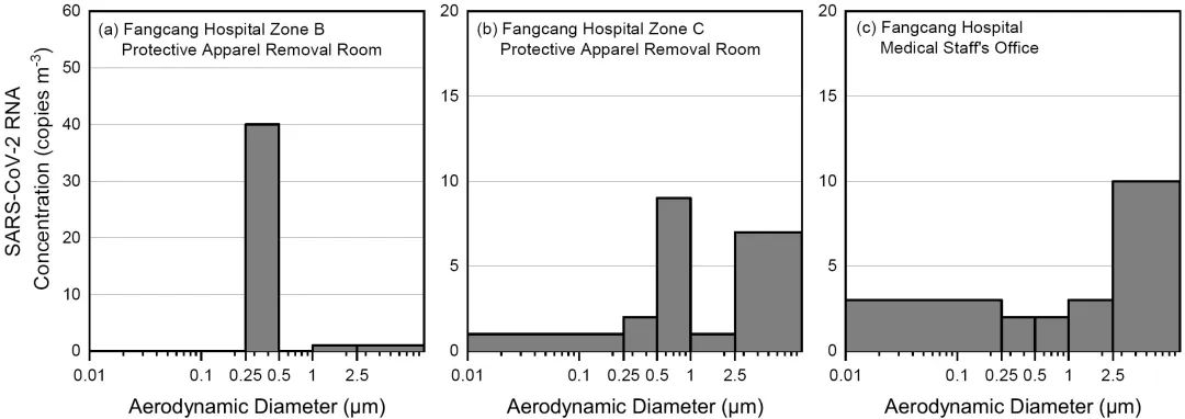 研究结果表明,在当时严格防控的条件下,两所医院和公共环境总体是安全的。但在患者使用的厕所中气溶胶病毒载量较高,提示患者大小便冲水过程可能是病毒气溶胶的一个重要来源;在人流聚集的超市附近和医院楼栋通道等可检出一定的气溶胶病毒载量,说明人员聚集时病毒携带者与周围人群存在潜在的气溶胶传播风险。此外,团队通过分析病房落尘样品和医护人员脱防护服区域的病毒气溶胶载量和粒径分布,首次揭示了新冠病毒气溶胶的空气动力学特征,提出了病毒气溶胶“沉降(衣物/地面)—人员携带—空中扬起”的传播模型。