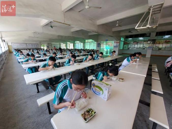 清城中学学生饭堂间隔开单人座位,间隔板上印有复习资料。学校表示,本来吃饭是放松的时间,现在不允许聊天说话,比较沉闷,希望通过这种方式给同学们增加点乐趣,调节紧张的心理。