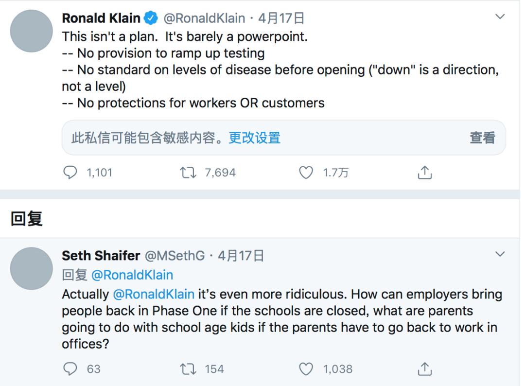 对于重启计划,民主党人一如既往地批评。曾担任两任民主党副总统幕僚长、2014年至2015年担任白宫埃博拉病毒应对小组协调员的Ron Klain在推特上说,这份18页的指南,不是计划,只是PPT,在没有检测、没有对疾病分级进行标准认定,也没有对工人和消费者安全保护的情况下,复工不现实。