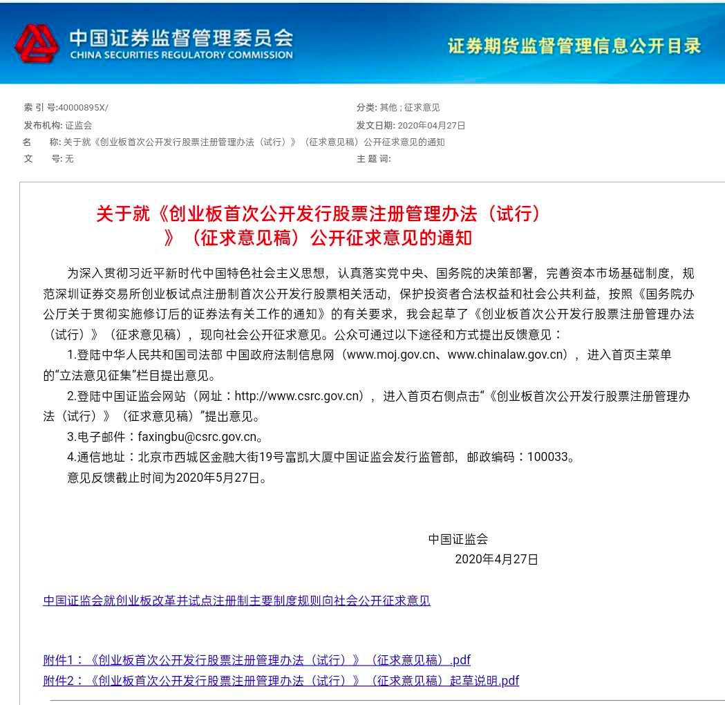 当日晚间,深交所就创业板改革并试点注册制的相关配套业务规则公开向社会征求意见。