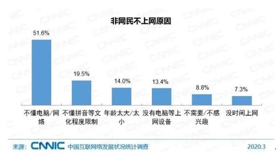 使用技能缺乏、文化程度限制和年龄因素是非网民不上网的主要原因。数据显示,因为不懂电脑/网络技能而不上网的非网民占比为51.6%。