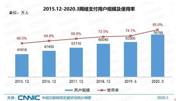 截至2020年3月,我国网络支付用户规模达7.68亿,较2018年底增长1.68亿,占网民整体的85.0%;手机网络支付用户规模达7.65亿,较2018年底增长1.82亿,占手机网民的85.3%。