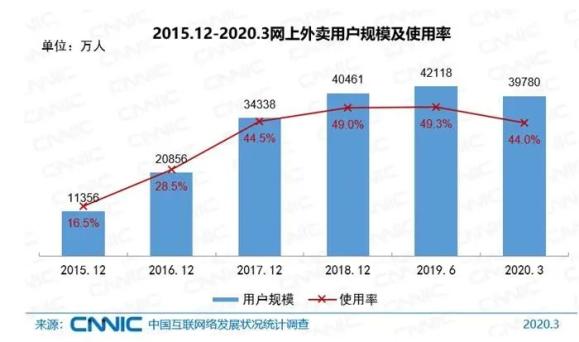 截至2020年3月,我国网上外卖用户规模达3.98亿,占网民整体的44.0%;手机网上外卖用户规模达3.97亿,占手机网民的44.2%。