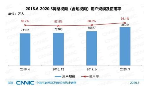 截至2020年3月,我国网络视频(含短视频)用户规模达8.50亿,较2018年底增长1.26亿,占网民整体的94.1%。