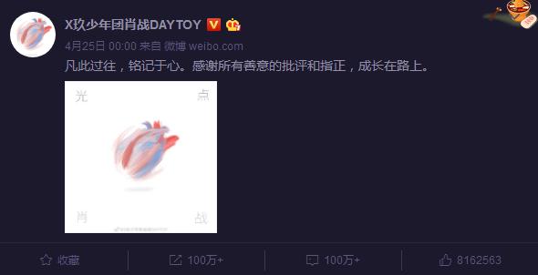 4月25日零点,肖战发布一条微博,“凡此过往,铭记于心。感谢所有善意的批评和指正,成长在路上。”似是对之前发生的所有事情的回应,同时,肖战工作室宣布新单曲《光点》发布,这是肖战演唱红歌《红梅赞》之后的正式复工。