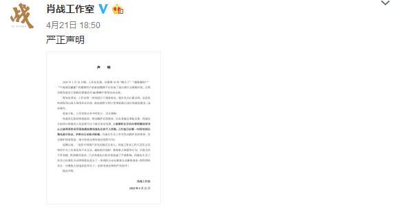 4月21日,肖战工作室发布声明,称工作室发现微博用户“鹅太子”“超级逮虾户”“午夜南瓜霸霸”等用户在网络上故意抹黑肖战,已经报案,且将对一些冒充肖战本人及工作室发表不实言论、教唆网暴等用户进行取证。