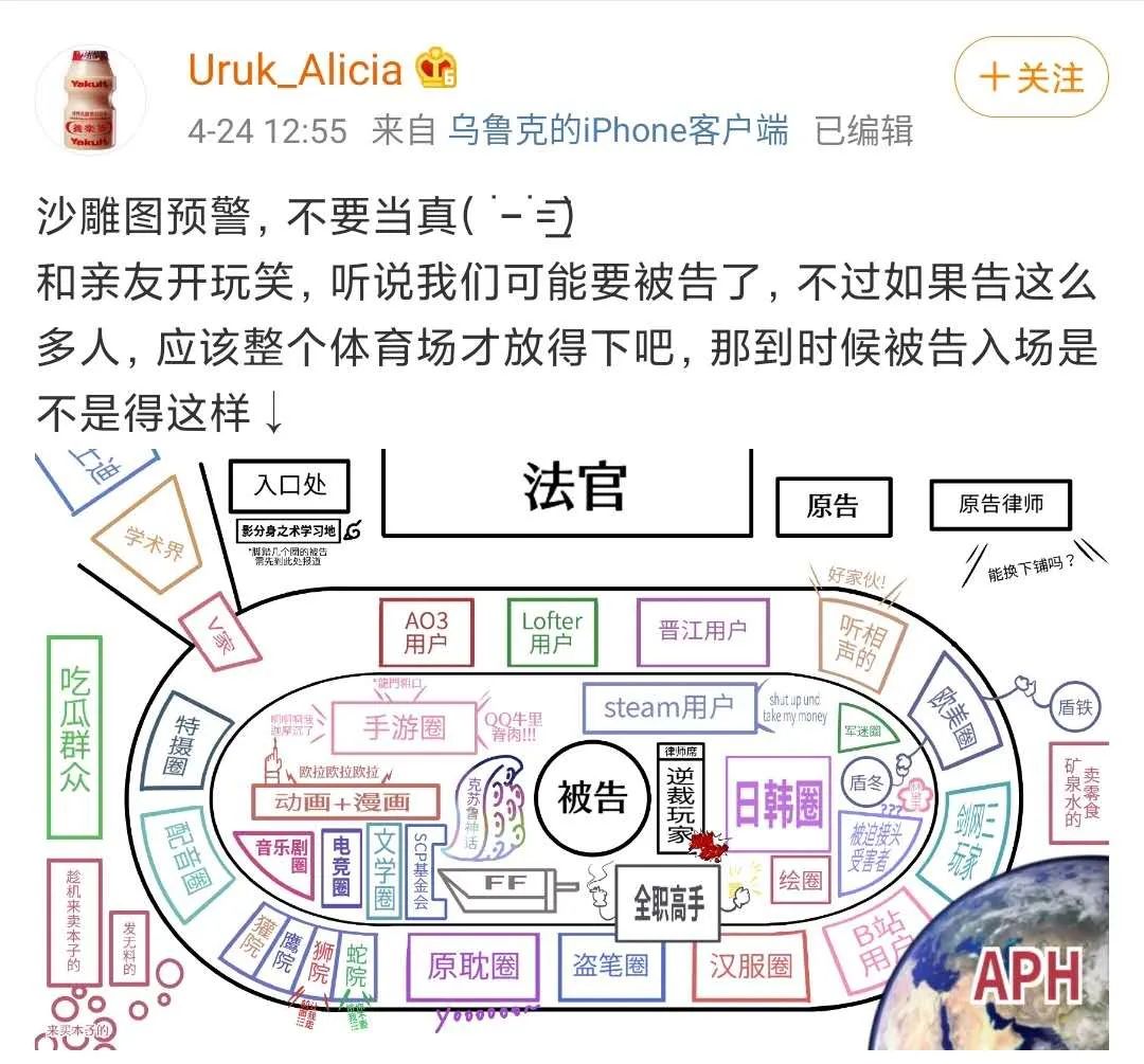然而,这份标注着“战必胜”的律师声明依旧未起到警告作用,由于这份律师声明斥责的对象已然将众平台“227事件”的参与者包含在内,有网友将此称为《对万国宣战书》,更绘制了一场要素众多的“庭审图”。