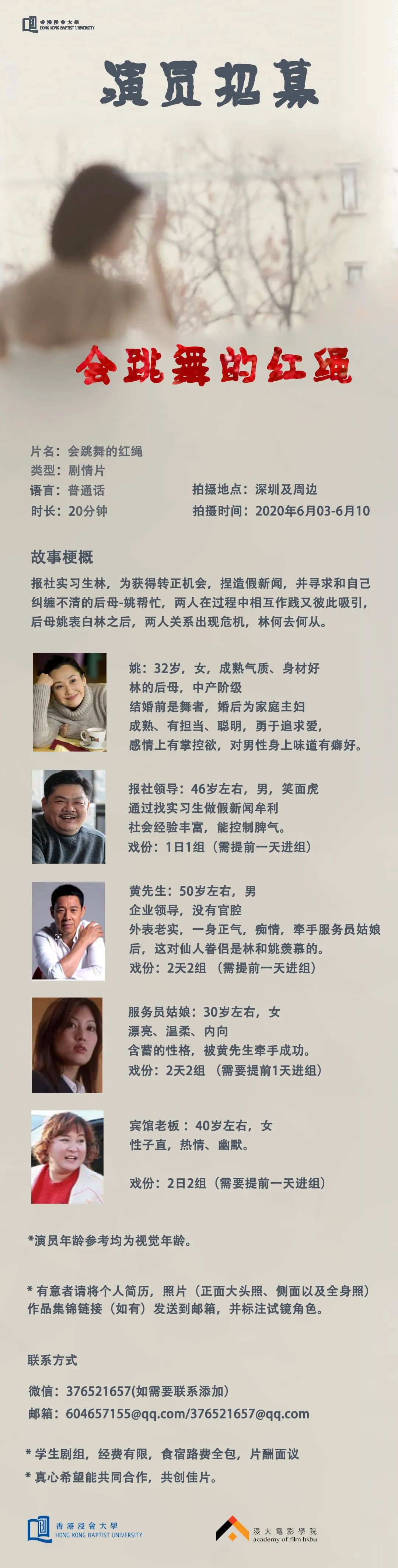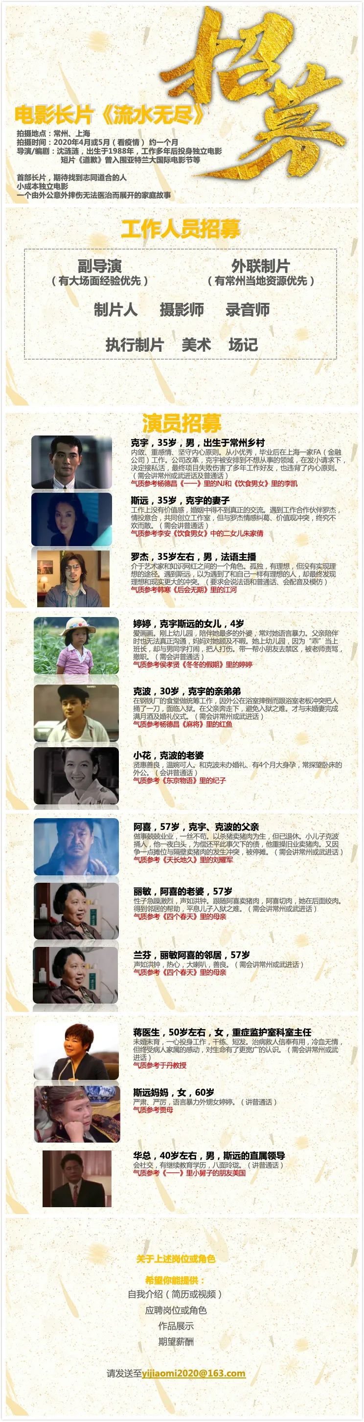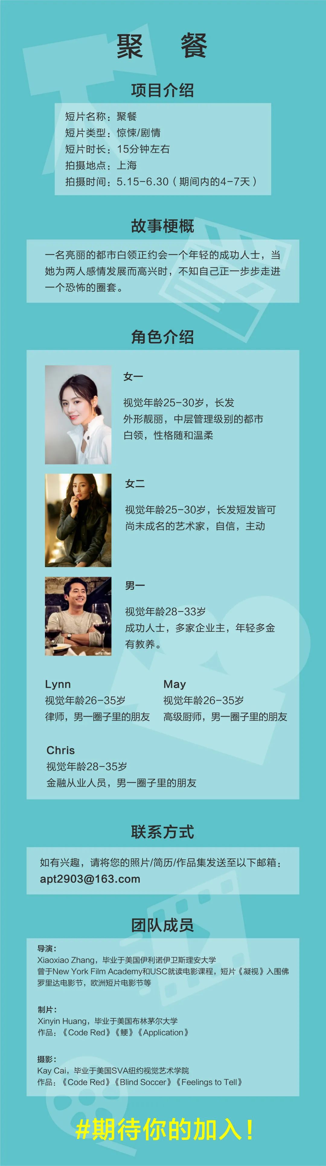 邮件标题/微信申请提示“演员角色/剧组岗位+真实姓名”。请发送个人简历,照片(演员),作品集至联系人。