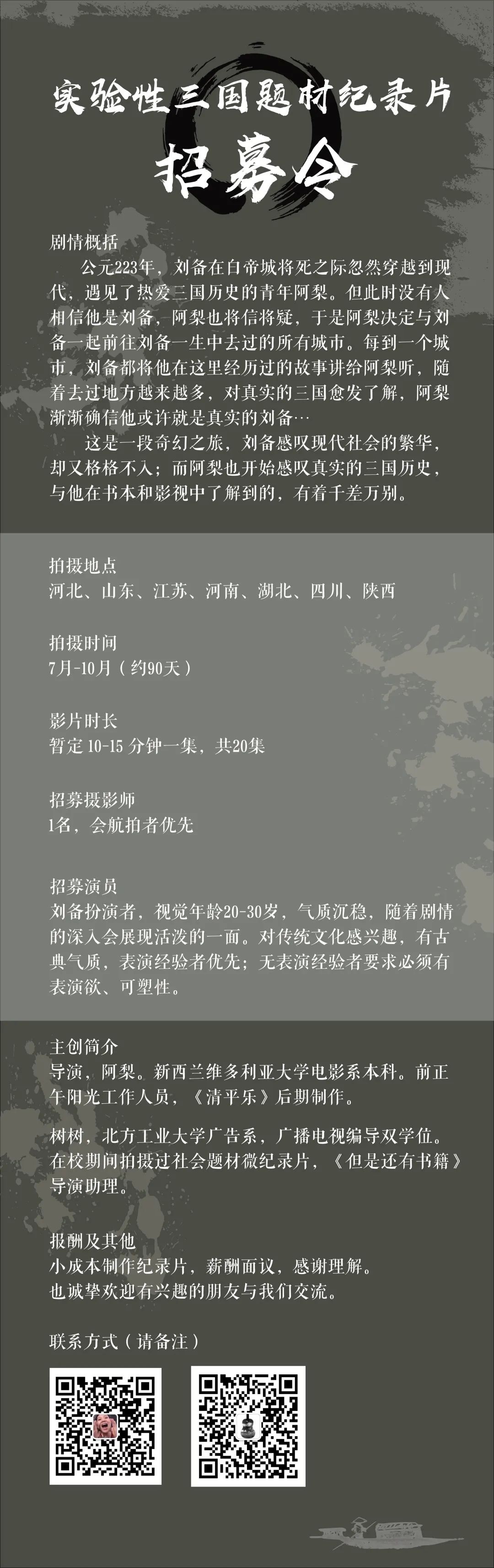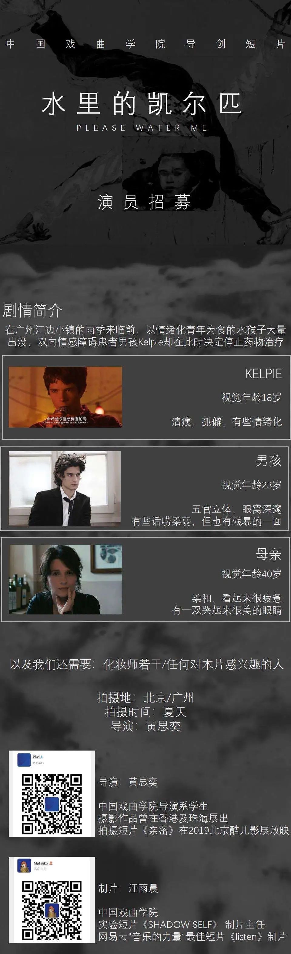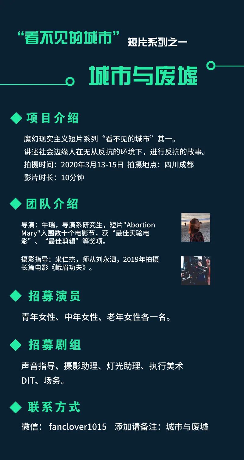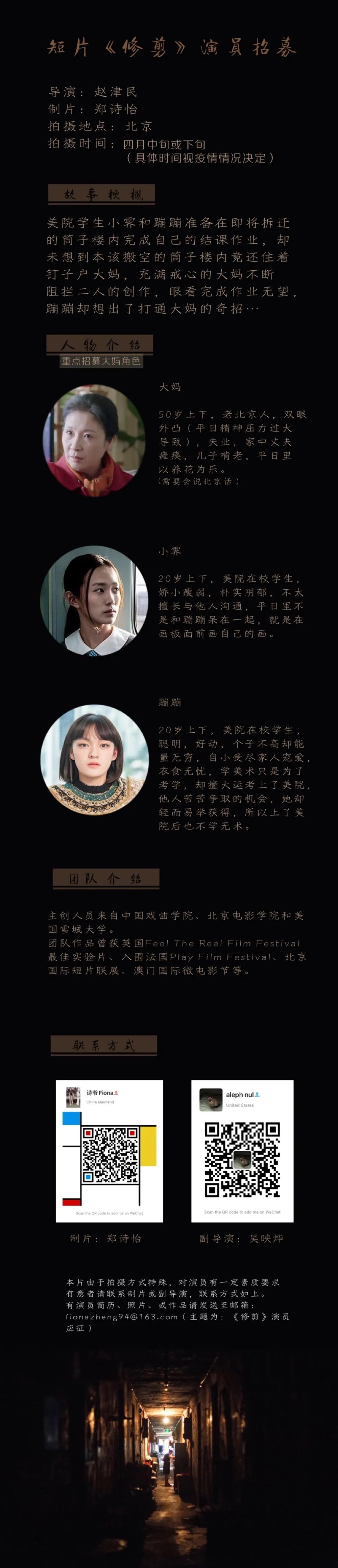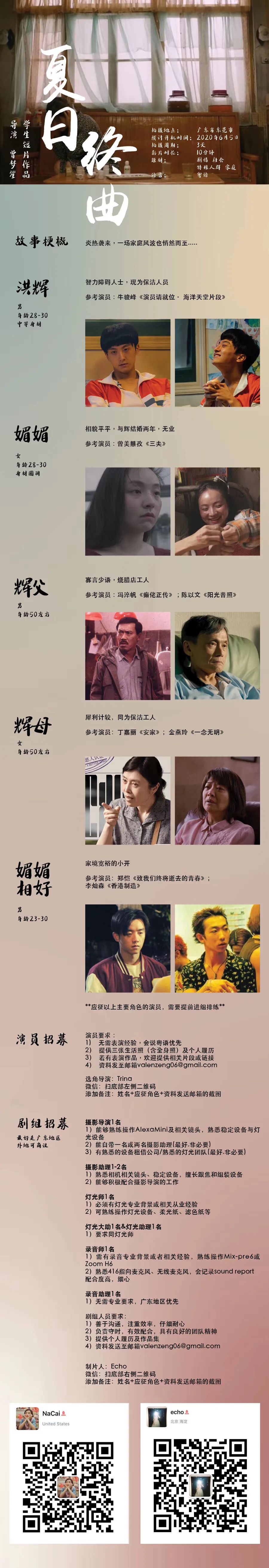 邮件标题/微信申请提示“演员角色/剧组岗位+真实姓名”。请发送个人简历,作品集至联系人。