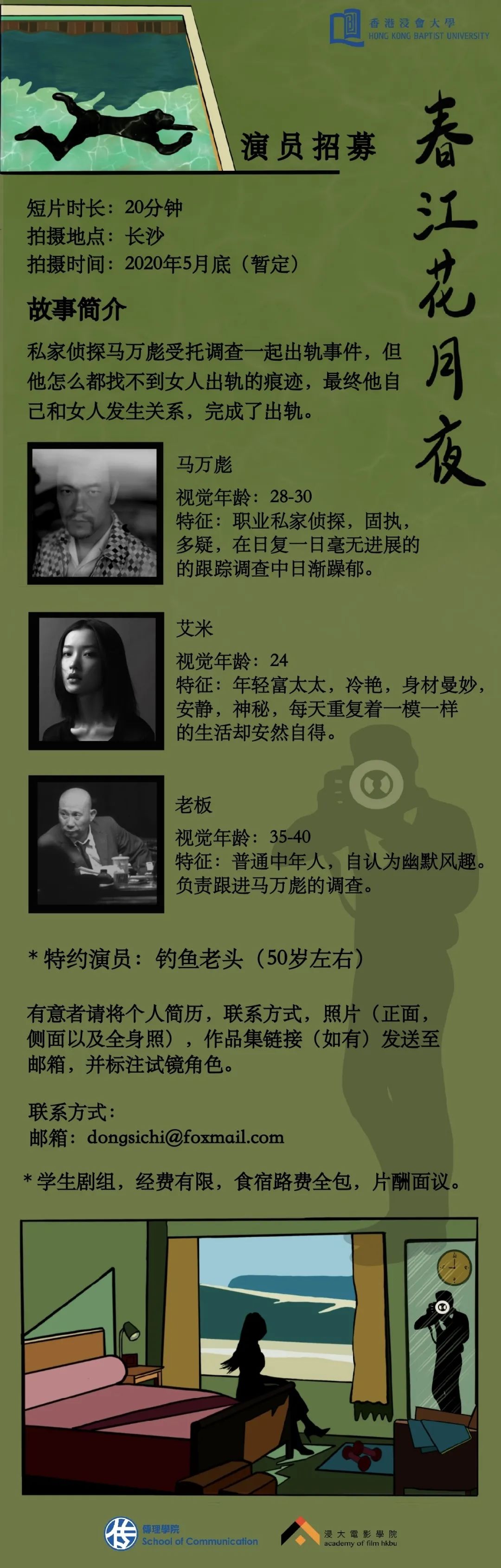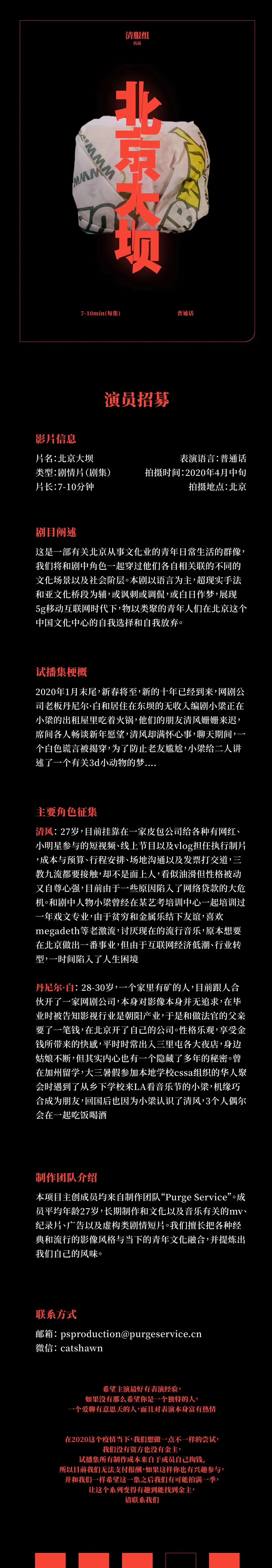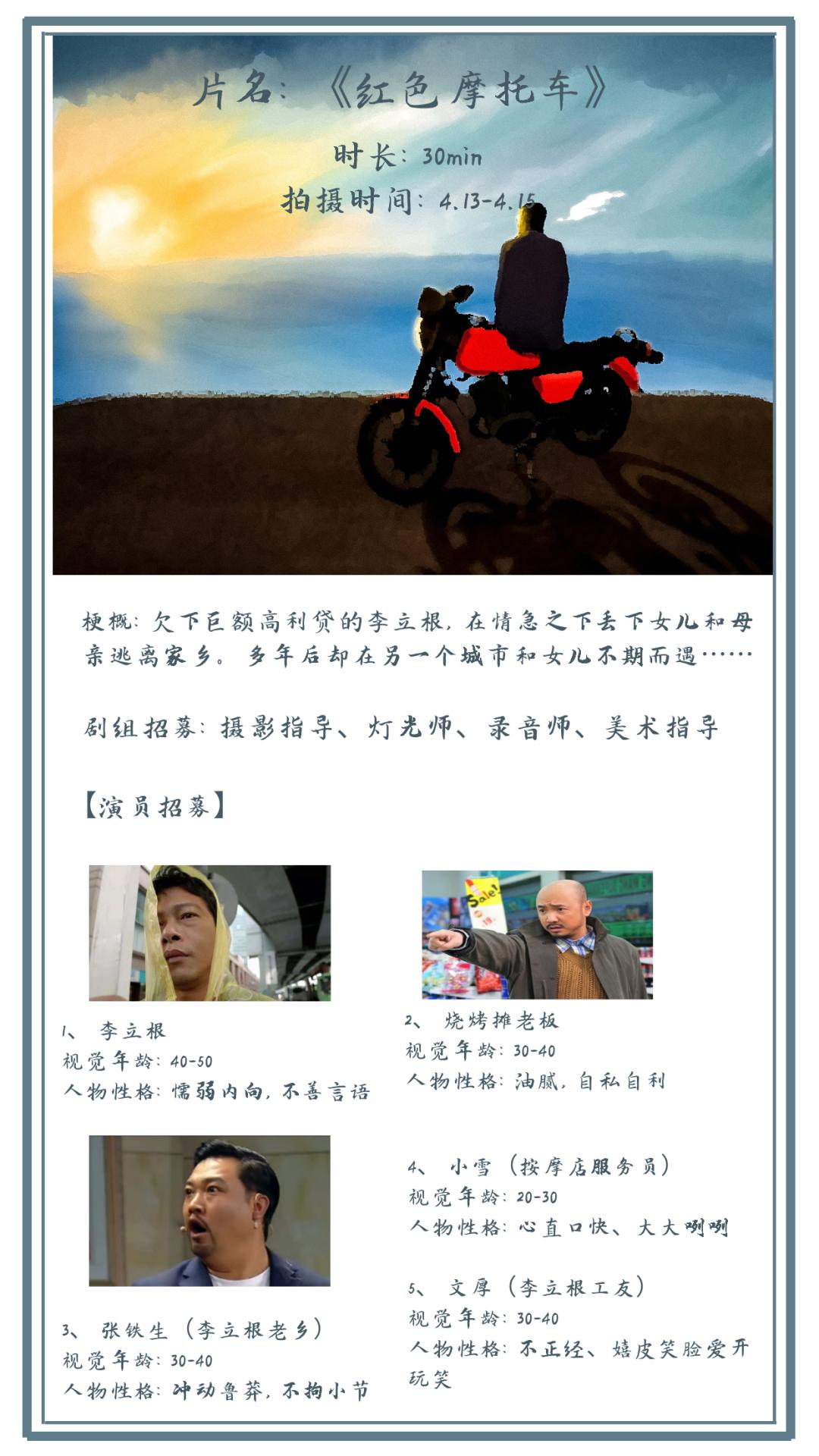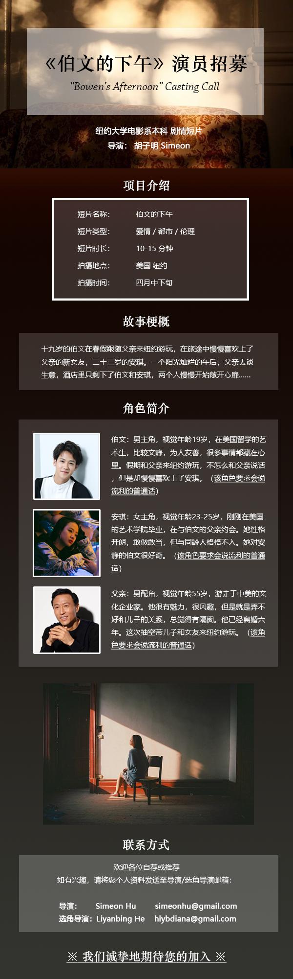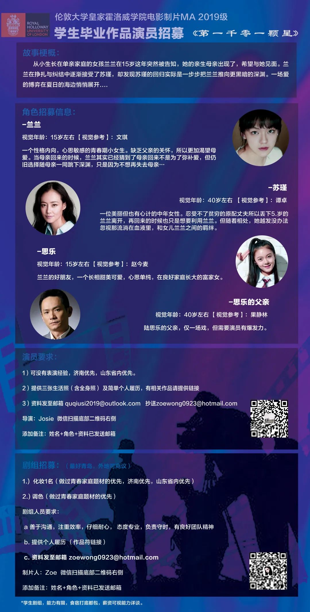 邮件标题/微信申请提示“演员角色/剧组岗位+真实姓名”。请发送个人简历,作品集至联系人。