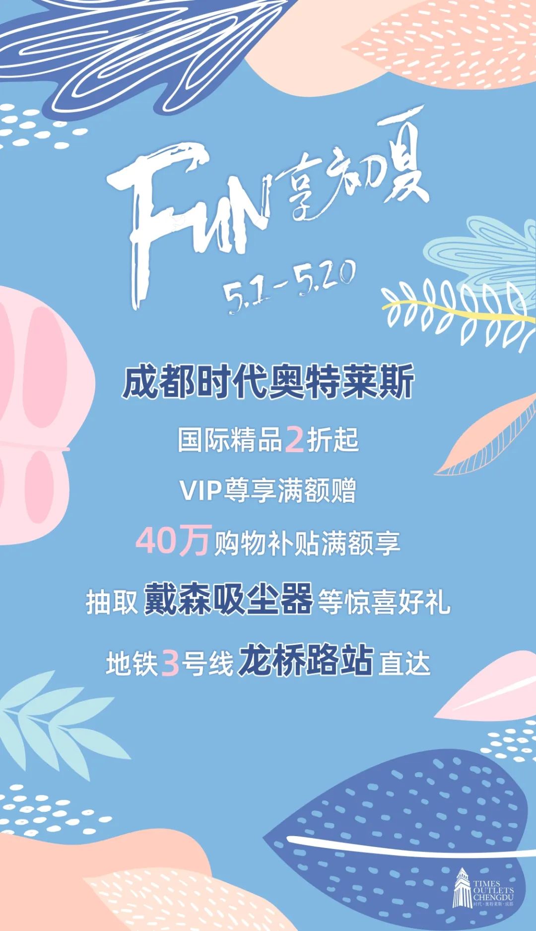 作为成都人最喜欢淘货之选的时代奥莱,假期活动也是诚意满满,五月开启了“FUN享初夏”主题购物活动,时间从5月1日持续到5月20日。