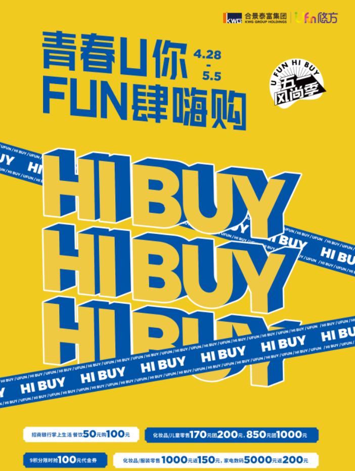 UFUN悠方购物中心在五一假期期间为大家打造了一个“青春U你 FUN肆嗨购”的活动。正如主题,就是一个字“买”!