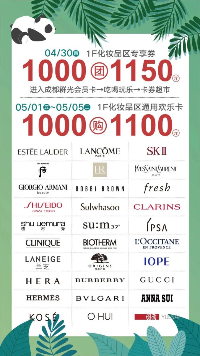 成都群光广场1F的化妆品区特别设置了“五一定制福利”,现场可1000元团价值1150元的化妆区专享券,五一假期期间还可以1000元购1100元通用欢乐卡。