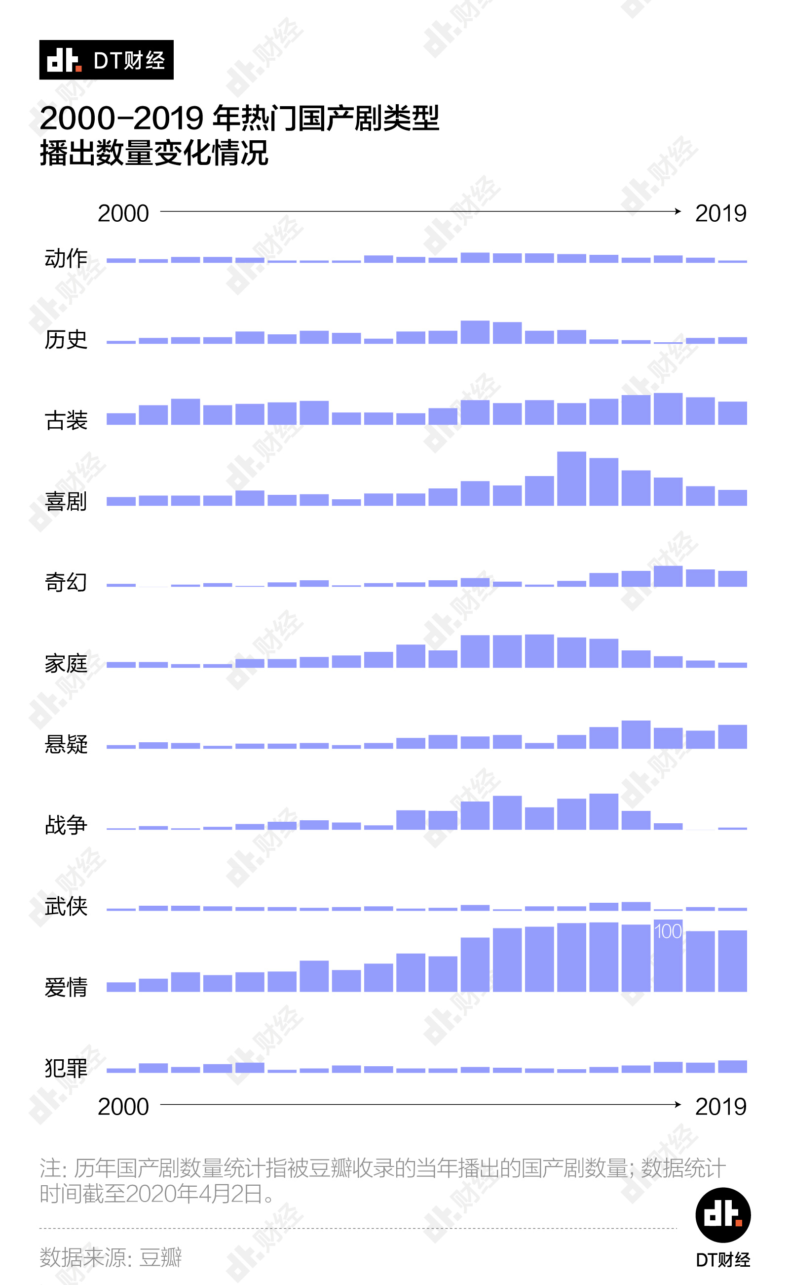 我们比较了近20年来各类电视剧的播出数量,发现以上猜测的确有迹可循。