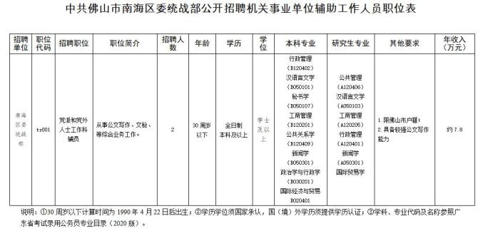 根据工作需要,中共佛山市南海区委统战部公开招聘机关事业单位辅助工作人员 2名,现制定招聘方案公告如下: