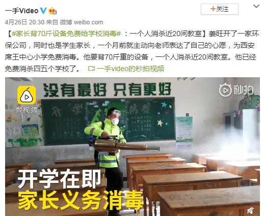 西安一位学生家长,主动要求帮学校免费消毒,一人背70斤重的设备,消杀了近20间教室,一出手就帮了四五所学校。