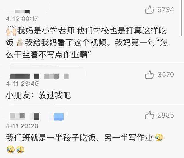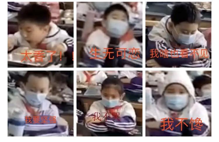 小小课桌尽显世间百态:面对同桌埋头餐盘大快朵颐的演绎,面对隐隐穿透口罩的饭香诱惑,端正就坐的小学生只得攥紧自己的手臂、绷紧神经和眉头……