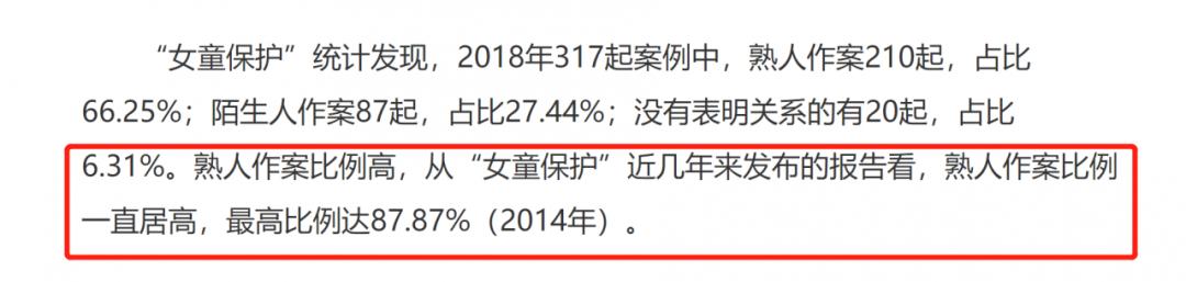 同时,根据调查显示,针对孩子的性侵,熟人作案比例一直非常高。在近几年的逐年统计中,最高的一年熟人作案的比例竟然达到87.87%。