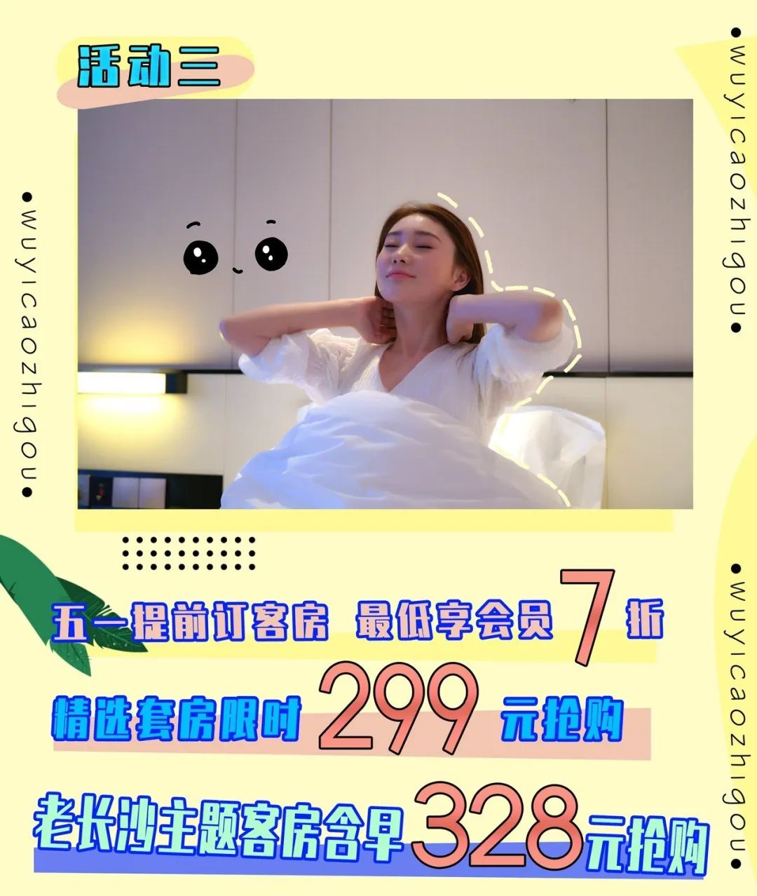 五一提前订客房,最低享会员7折,精选套房限时299元抢购,老长沙主题客房含早328元抢购。