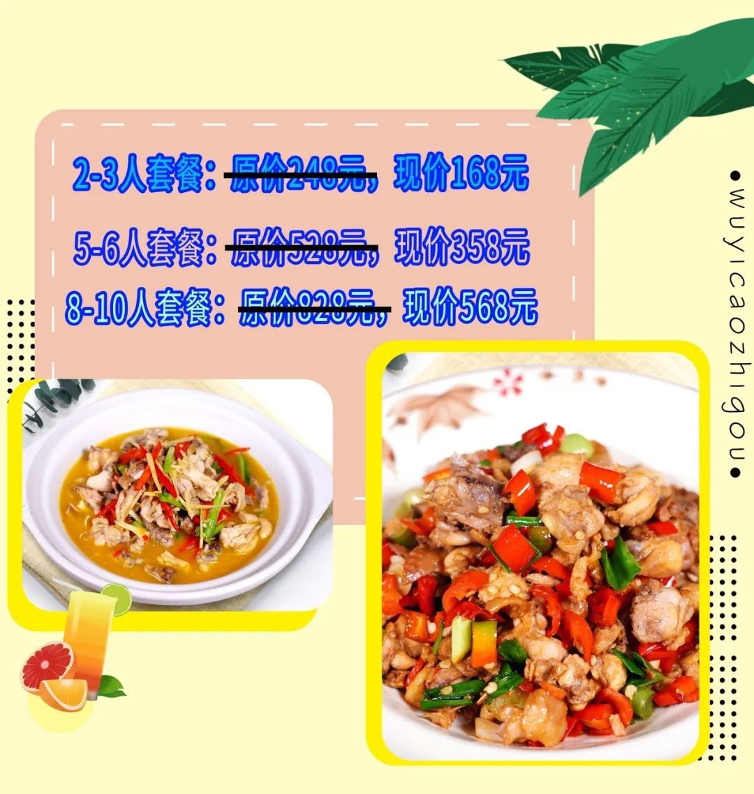 B套餐:酱椒肉炒肉、白切清远鸡、香煎黄花鱼、酸菜炒蚕豆、清炒小菜、煎玉米饼、猪油拌粉、水果