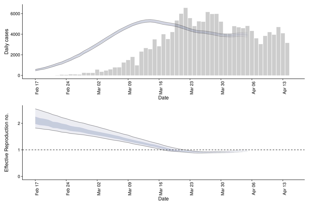 德国的数据和意大利的数据结果差不多,他们封锁也是在3月23日左右,之后R值差不多在1左右徘徊,说明这种社交距离的干预措施非常有帮助,能够降低R值,但还是不能够把R值降到比1小很多。