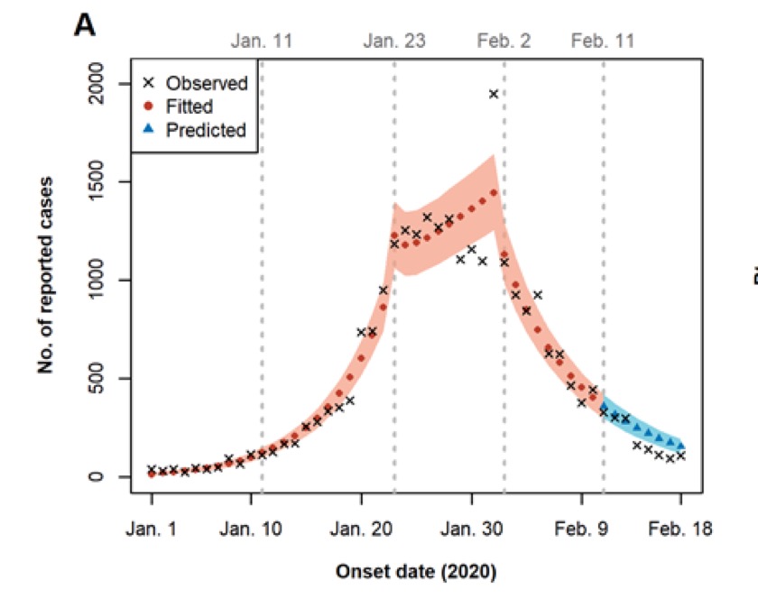 这就是讲到了集中隔离,2月1日方舱医院建立之后实行了集中隔离,这之后R值就降了很多。当时我们在预印本中,建立模型,预测了2月9日到2月18日的数据,就是图中蓝色的部分。可以看到,这个预测和实际观测数据很接近,说明这个预测模型还是挺好的,这个R值降很多,大概0.3左右。