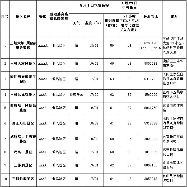 2020年4月30日,宜昌市46家A级景区中已有35家开园。35家景区的PM2.5平均浓度为22至43,3家景区的PM2.5平均浓度低于35微克/立方米,达到国家标准一级水平;另有32家景区PM2.5平均浓度达到国家标准二级水平。预计5月1日所有A级景区均处于新冠肺炎低风险区,全市天气为晴,14-33℃。