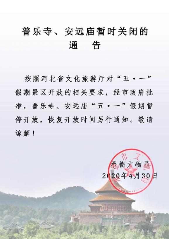 布达拉·行宫景区、普宁寺景区和磬锤峰国家森林公园暂未批准开放,开放时间另行通知。