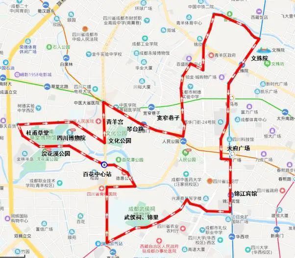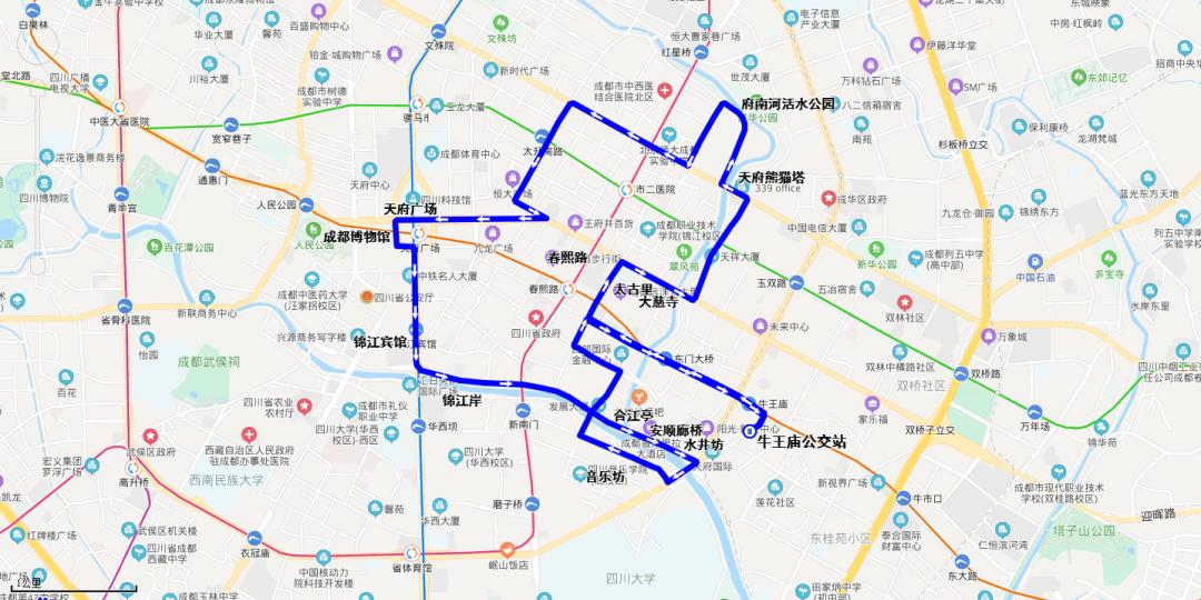 九眼桥西(水井坊)发出,经滨江东路、天仙桥南街、天仙桥北路、蜀都大道东风路、望平街、猛追湾街、建设路、二环路东二段、建设南路、圣灯路、杉板桥路、新鸿路、猛追湾街、望平街、东风路、大慈寺路、纱帽北街、三圣街、镋钯街、天仙桥南路、滨江东路至合江亭(安顺廊桥)。