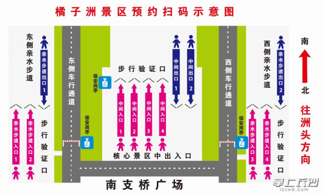从5月1日起,橘子洲景区实行预约扫码入园, 扫码出入口为核心景区中间入口及沿江亲水步道东、西出入口等3个通道(其中入口8个,出口4个),原东、西车行通道步行区域关闭,保留电瓶车通道,市民、游客需要持预约码,从上述3个通道排队扫码验证入园。