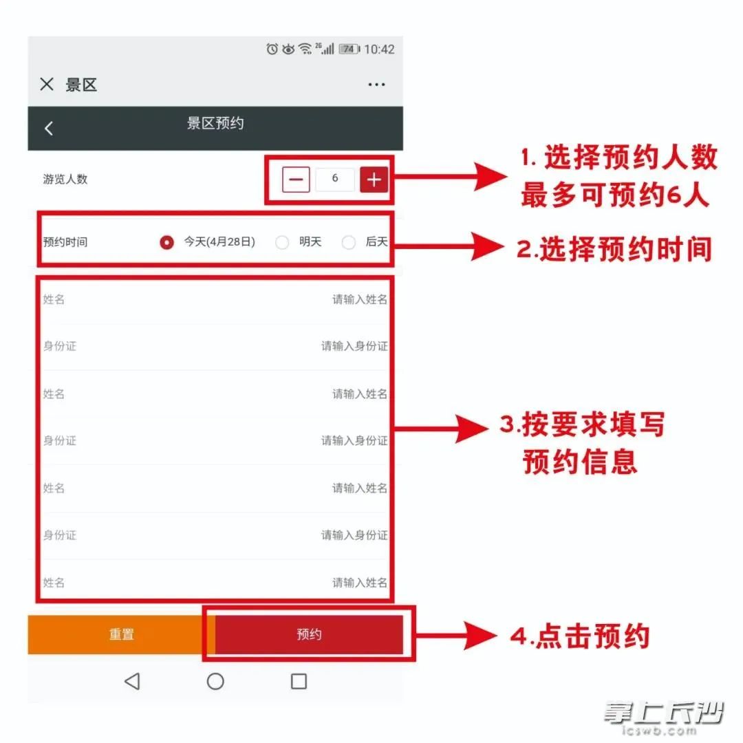 扫码关注“岳麓山橘子洲旅游区”官方微信,选择左下角景点预约,选择“橘子洲”进行预约后进入页面,选择游览人数(最多可预约6人)、预约时间,填写好个人信息,点击右下角预约。预约成功后,出现入园二维码,使用时请向景区工作人员展示。如果没有提前预约,景区入口提供预约二维码,可在入口扫码,并提供健康码入园。但一旦人流过大,景区将实施分流措施,控制入园人数。
