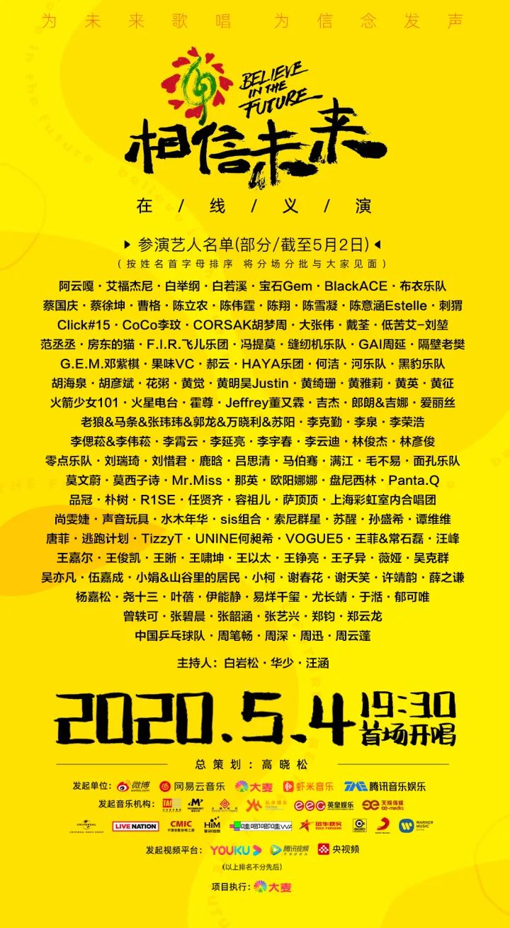 “相信未来”线上义演,由微博、网易云音乐、大麦、虾米音乐、腾讯音乐娱乐集团等五大平台共同发起,著名音乐人高晓松担任总策划,堪称中国音乐史上最大规模的线上义演。截至5月2日,130余组音乐人、3位主持人已确认加入义演行列。