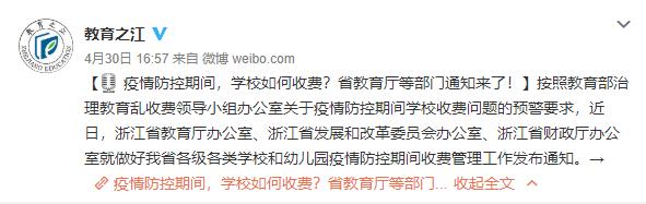 近日,浙江省教育厅办公室、浙江省发展和改革委员会办公室、浙江省财政厅办公室发布通知,做好各级各类学校和幼儿园疫情防控期间收费管理工作。