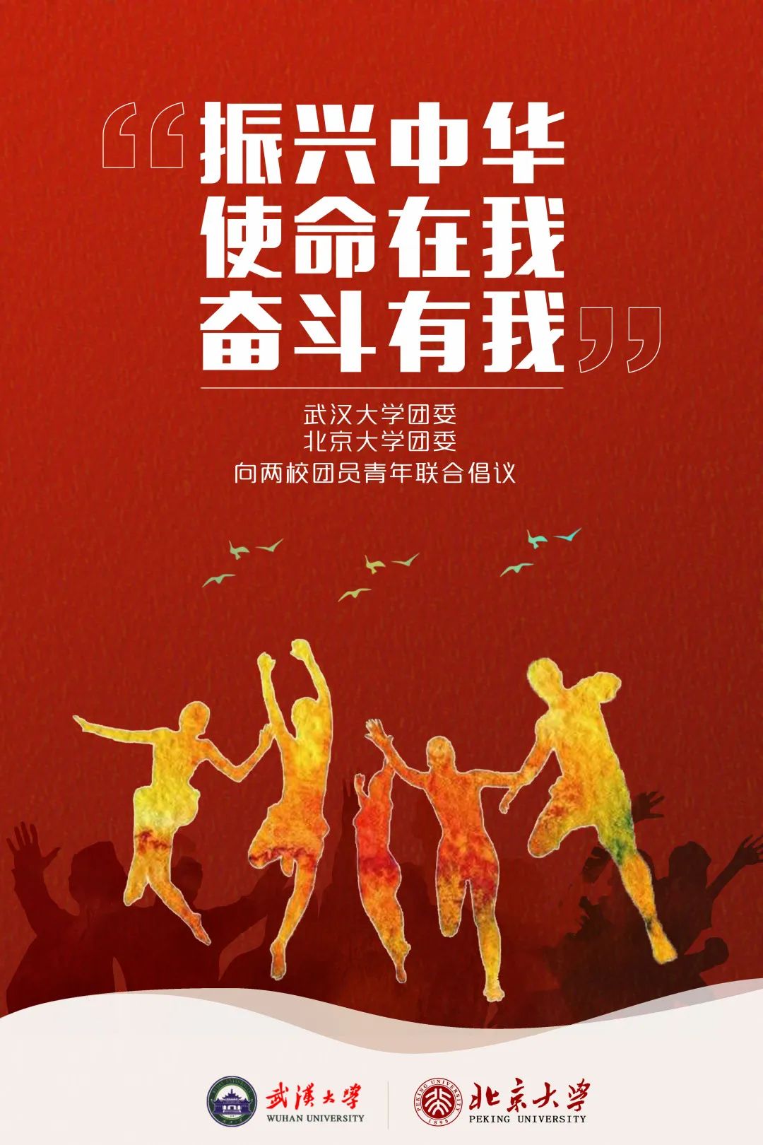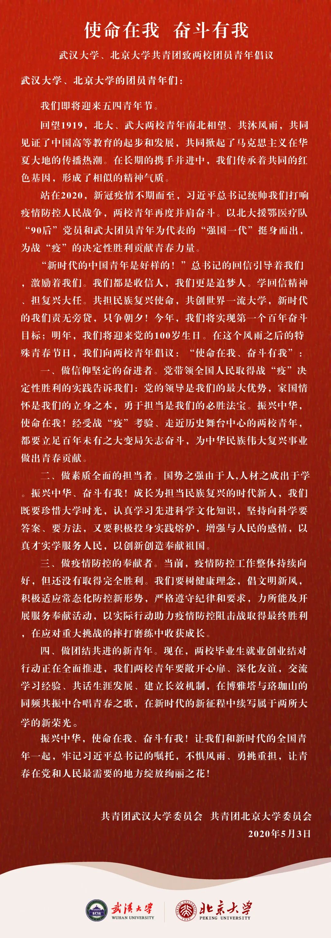 武汉大学团委联合北京大学团委,向两校青年发出“使命在我,奋斗有我”的倡议,号召团员青年做信仰坚定的奋进者、做素质全面的担当者、做疫情防控的奉献者、做团结共进的新青年,让青春在党和人民最需要的地方绽放绚丽之花!