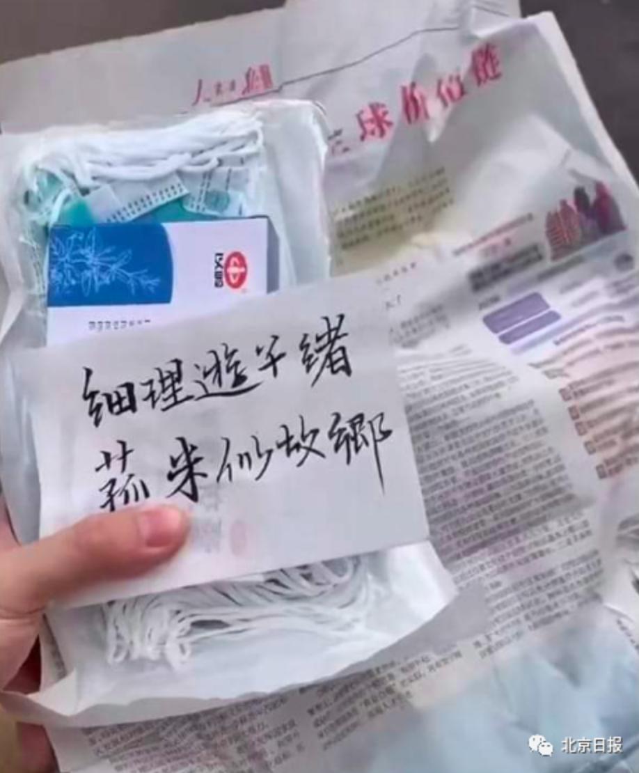 一位在意大利米兰留学的学生,就晒出自己的健康包,里面有20个口罩,一盒莲花清瘟,还有手写的两句唐诗,「细理游子绪,菰米似故乡」