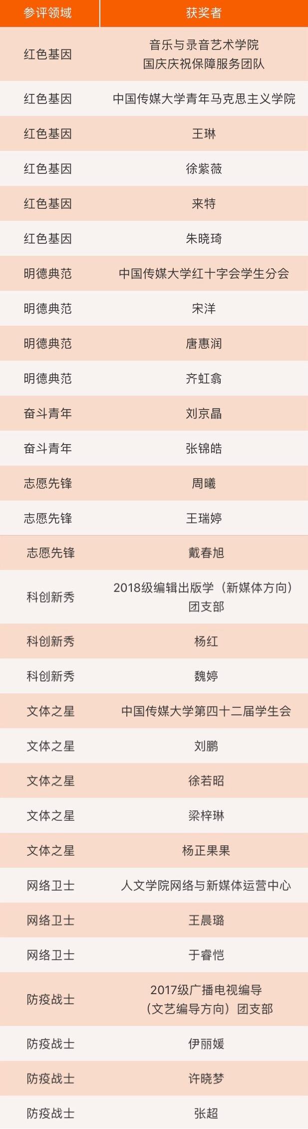 由于今年五四仍处于疫情防控期间,学校通过组织线上评选,评比表彰了“中传青年五四奖章”获得者、优秀团员获得者、优秀团干部获得者,共有30个集体和个人获得“中传青年五四奖章”,209名同学获评“优秀学生团干部”,442名同学获评“优秀团员”。他们是广大中传青年的榜样,他们的身上体现着新时代中传青年的风采、责任和担当。