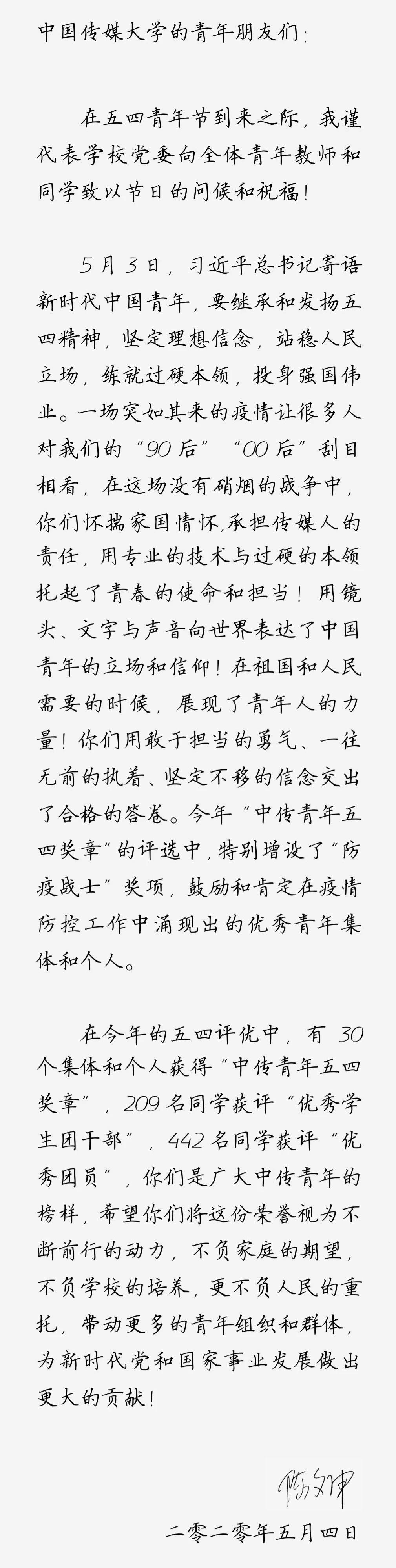为表彰和激励优秀青年更加积极向上,牢记使命担当,勇挑时代重担,在实现中华民族伟大复兴中国梦的新长征路上奋勇搏击,校党委书记陈文申亲笔写下了一封信,表达对我校青年教师、青年学子的谆谆教诲、殷殷嘱托。