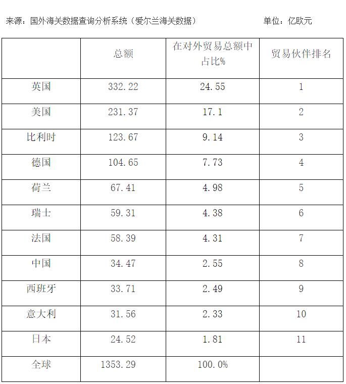 与英国关系的慢慢交好,也是爱尔兰能够获得长足进步的一个重要原因。基于地理环境的天然毗邻,英国目前是爱尔兰第一大贸易伙伴,两方的产业互补程度极高。尽管因为北爱尔兰问题双方曾闹出过小摩擦,但随着《北爱和平协议》的签订,双边关系在大方向上并没有受到很大影响,经济往来总体上是一个较为健康的状态。