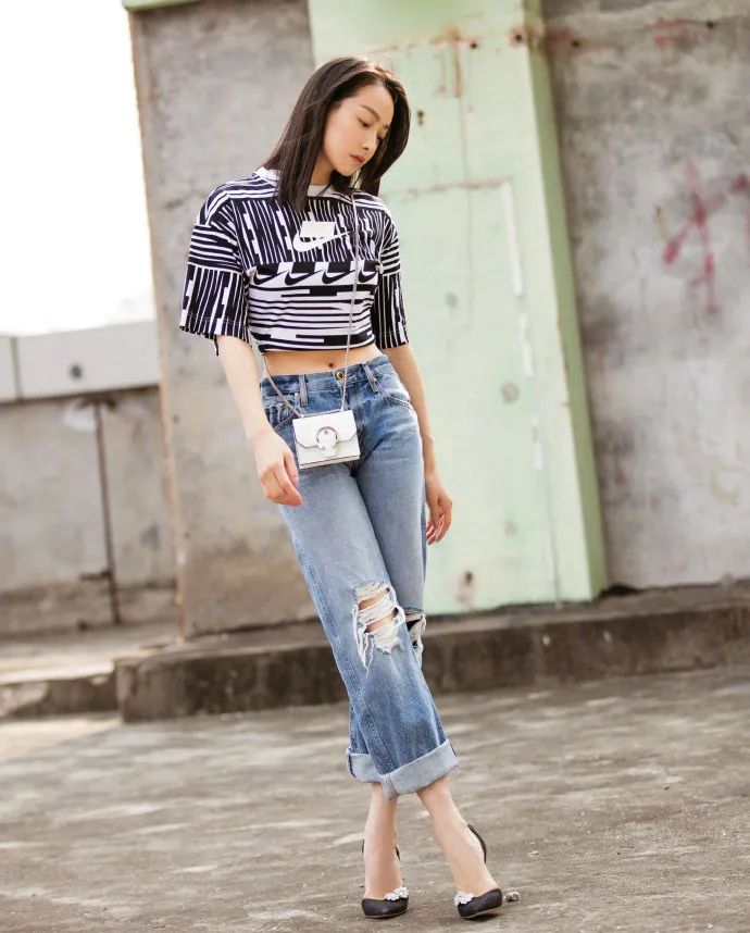 宋茜的NIKE条纹crop top+破洞牛仔裤,干练利落,冷酷中又中和了一些小性感。