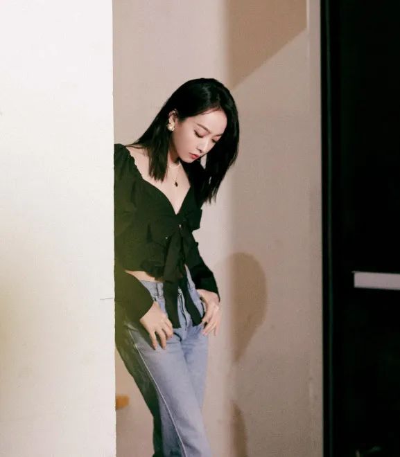 选择搭配牛仔裤的宋茜一如既往地不走常规路,泡泡袖V领衬衫款crop top,性感得很。