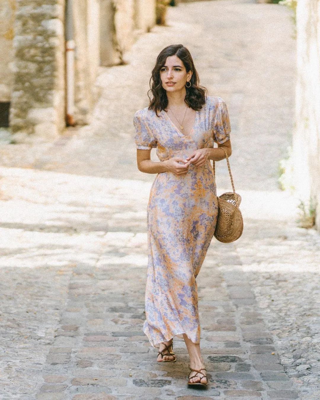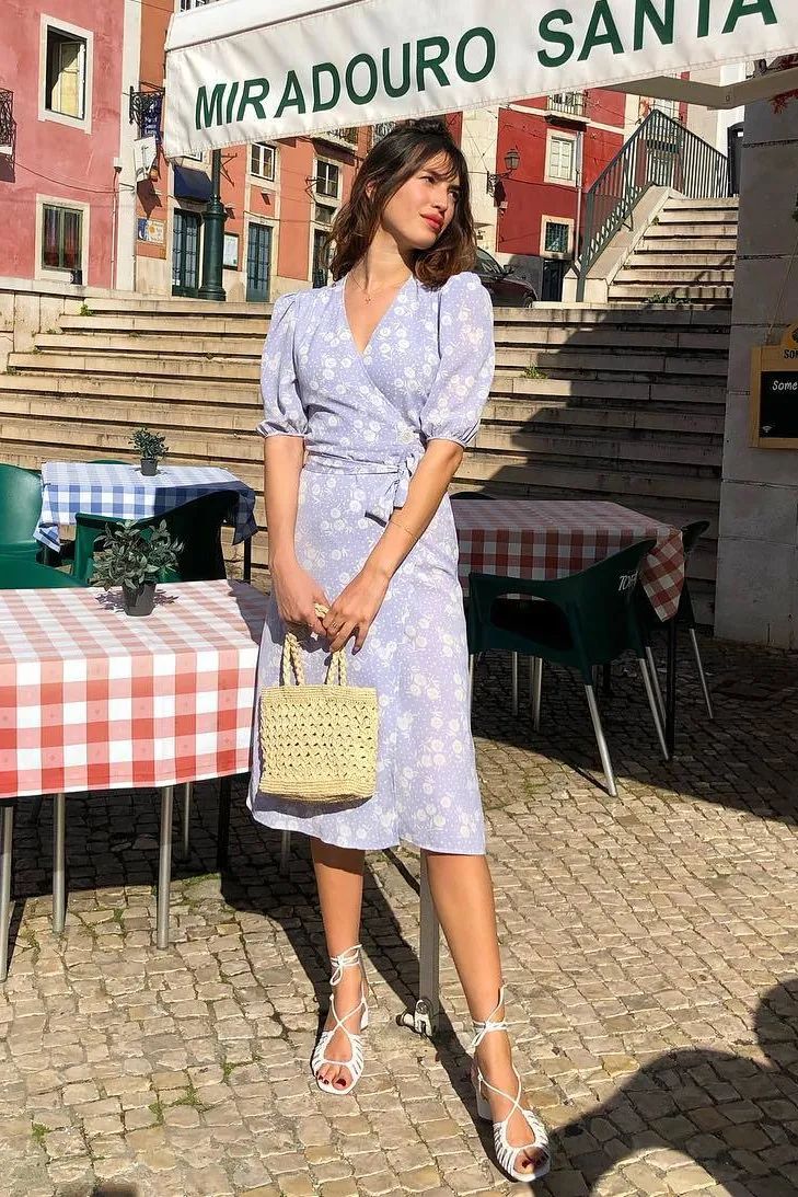 时尚博主 Jeanne Damas这一整套都能直接披上身,碎花裙+草编袋,最适合五月的两大元素出现了!