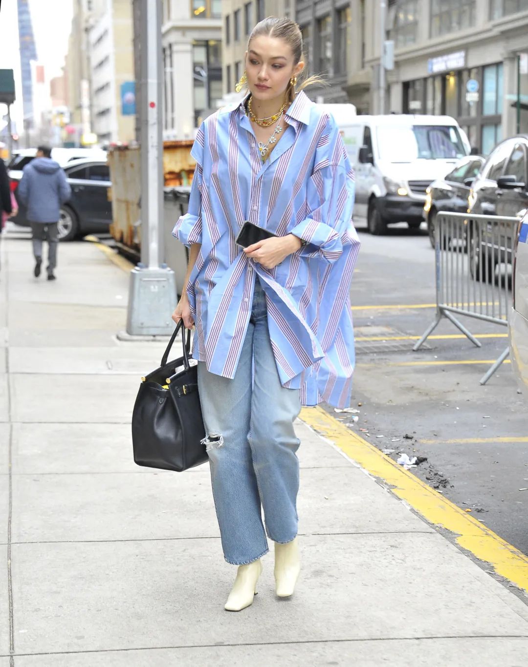 看阿拉吉吉,廓形条纹衬衫+阔腿牛仔裤,最基本最常见,但又最好搭。