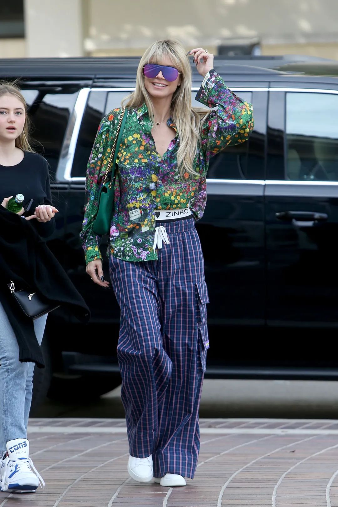 海蒂-克拉姆印花衬衫+工装阔腿裤,撞色元素完全掌控。