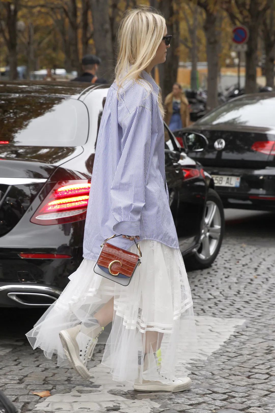 本来只是一件偷穿的boyfriend风条纹衬衫,搭上一条雪纺层叠半身裙后,时尚感一骑绝尘。