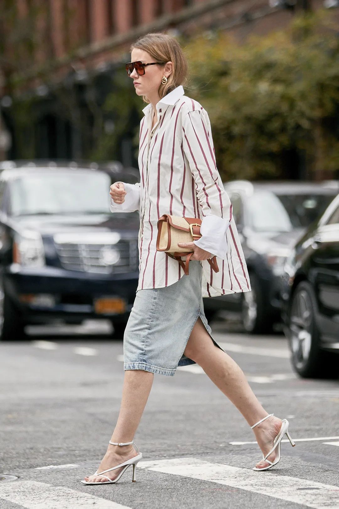 一样是条纹衬衫,换一条牛仔裙之后,秒变干练摩登女总裁。