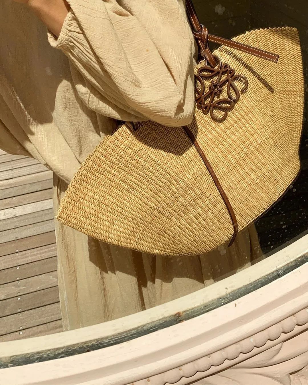 LOEWE这款扇形编织袋,郊游和通勤实用兼并,搭配一条棉麻质地长裙,去哪儿都能镇住场子。