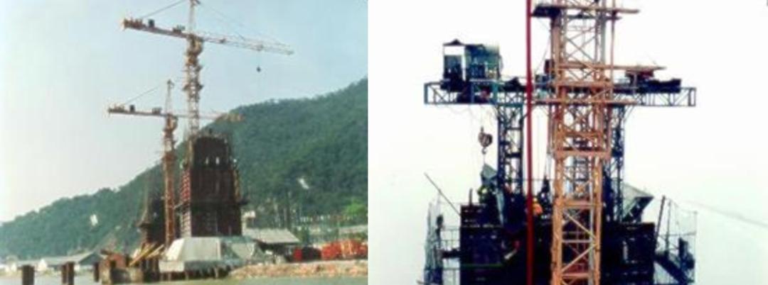 东塔采用翻转模板施工,西塔采用电动爬架拆翻模施工,系梁采用膺架法施工。东、西两塔施工后跨径差<8mm,相对精度为1/111000。