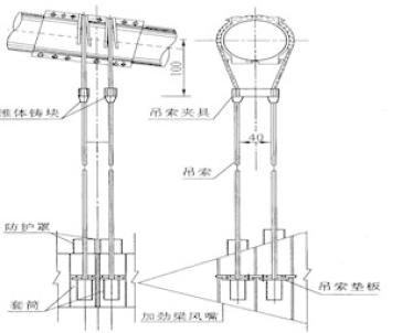 吊索在全桥的布置型式为平行竖直吊索,每个吊点由四根Ф52mm的优质金属芯镀锌圆股钢丝绳组成,吊索与主缆的连接采用背骑式,吊索通过主缆上的索夹槽口骑越主缆,锚于钢箱梁风嘴内。